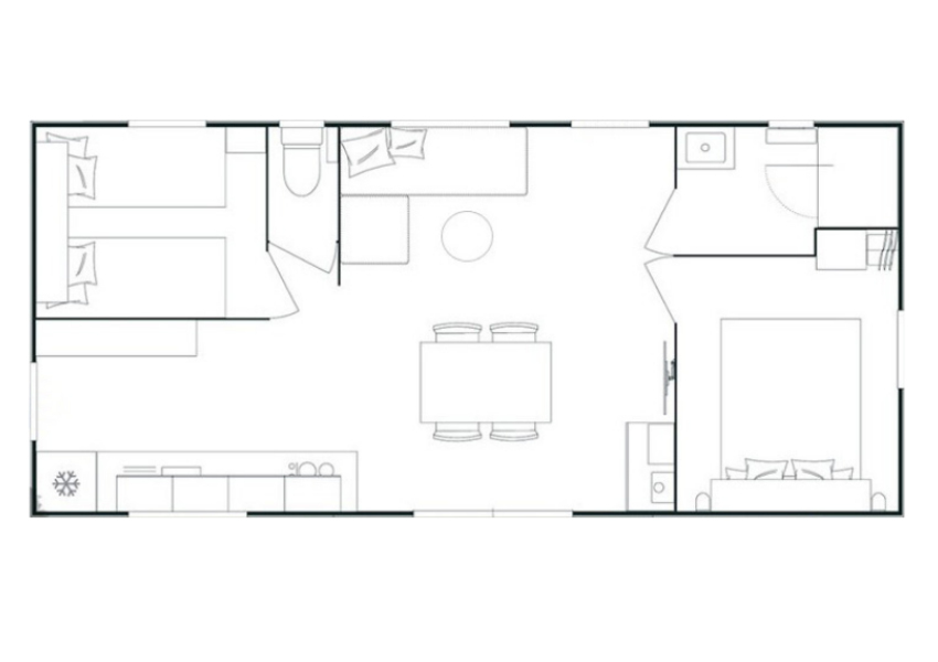 L’Aqua 3 est un mobil-home moderne et bien pensé, idéal pour les familles nombreuses ou les groupes d’amis. Il combine espace, confort et fonctionnalité.